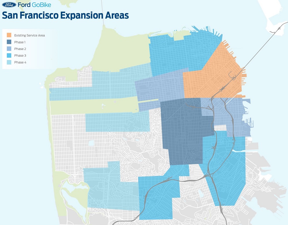The ten-fold expansion of Bay Area Bike Share will be fully funded by sponsor Ford Motor Company, and the system will be re-named Ford GoBike.