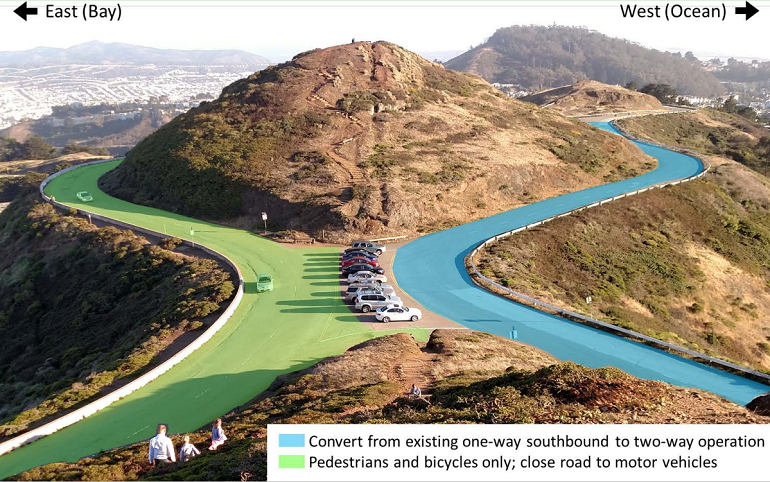 Under the pilot project, the eastern section of the roadway on Twin Peaks will be made car-free, and the western section will carry two-way vehicle traffic. (Note: The roads will not be colored blue and green – the colors in this rendering are for illustration purposes only.)
