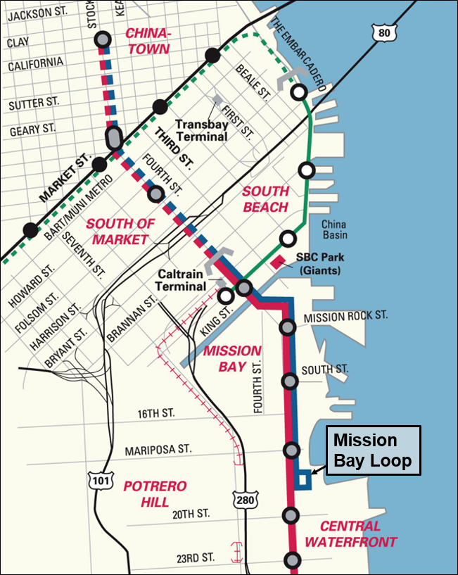 Now, the area is inhabited by campuses for the University of California, SF and Kaiser Permanente, new mixed-use developments and thriving commercial districts. And with the planned developments of the Warriors Arena, Crane Cove Park and Pier 70, the Mission Bay Loop will be essential to support the growing demand for transit service in this area.