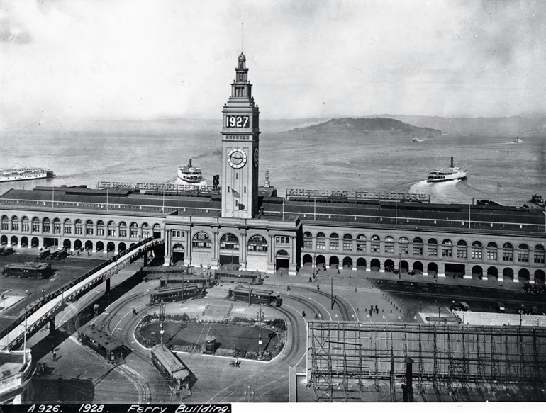 Prior to the construction of the trans-bay bridges in the late 1930s, the Ferry Building’s busy transit complex was a meeting point for ferries from destinations including Berkeley, Tiburon, Alameda, Oakland and Vallejo; for streetcars arriving down the main Market; and for pedestrians — who had a raised and protected walkway, visible on the left side of the image below.