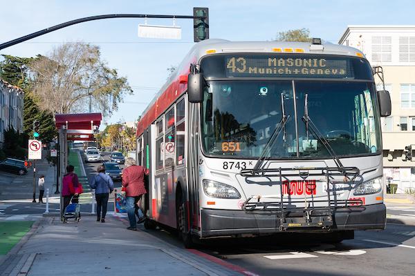 Along Frida Kahlo Way, the 43 Masonic will serve new transit boarding islands. They’re similar to this island on Masonic Avenue.
