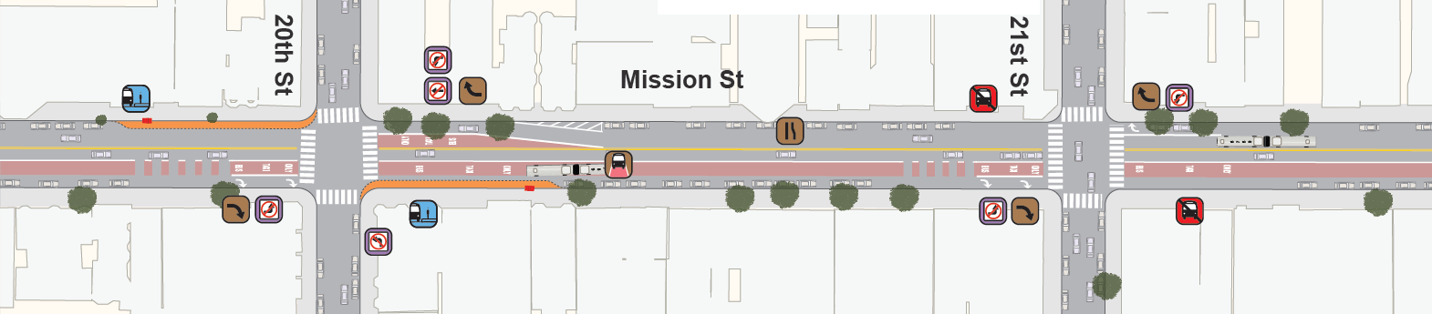 So what will Mission Street look like when this project is in place? Have a look below at a sample intersection to get a sense of how we’re redesigning the street to prioritize transit and pedestrian safety.