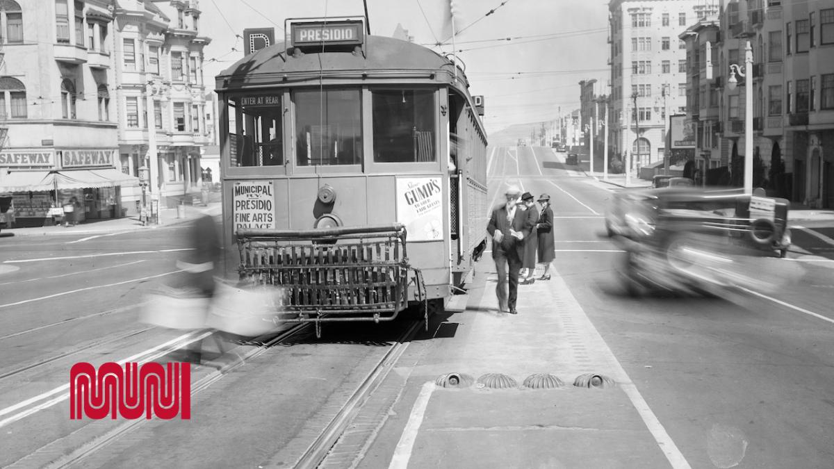 Historic image of M street car riding down Market street