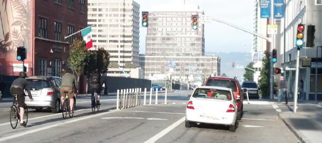 Before the improvements, people on bikes had to merge left across two lanes, then ride in a bike lane between four lanes of vehicles.