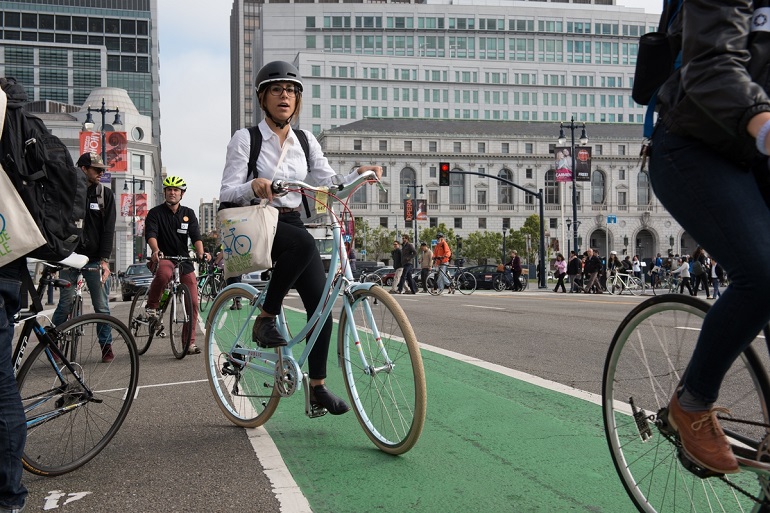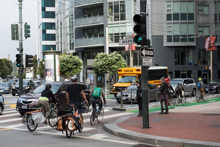 Bike commuters enter the Polk Street contra-flow protected bike lane at Market Street towards City Hall.