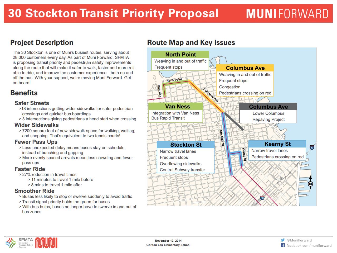 The SFMTA’s Muni Forward initiative is coming to the 30. Along the 30 Stockton Route, the proposed improvements on Van Ness, North Point, Columbus, Stockton and Kearny will reduce the transit travel time by 25 percent. As a part of this effort we are holding a public forum regarding the proposed changes.