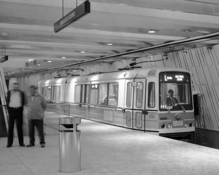 A test run of a Boeing LRV in the Muni Metro Subway at Embarcadero Station on January 26, 1978.