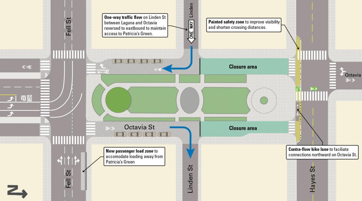As part of the Octavia Boulevard Enhancement Program, SFMTA is advancing a proposal to close one block of Octavia Street - between Linden and Hayes streets - to vehicular traffic to create safer travel conditions around Patricia's Green. The project is in response to long-standing requests from residents to calm traffic and create more public space around Hayes Valley's central gathering area.