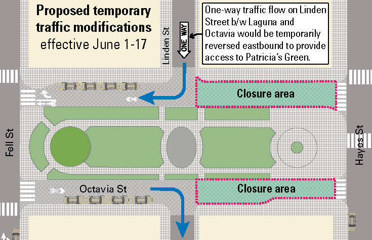 - To continue to provide access to Octavia St southbound between Linden and Fell streets, the one-way direction of the block of Linden St from Laguna to Octavia streets will need to be reversed to eastbound. Temporary signage and striping changes will direct traffic of the change and access to residences, businesses, and on-street parking will be preserved.