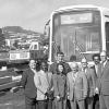 Public Utilities Commissioner Welton Flynn, designer Waltor Landor, and Muni General Manager Curtis Green unveil new orange Muni colors and Muni "worm" logo in the mid-1970s. Image X1970_7 from the SFMTA Photo Archive.