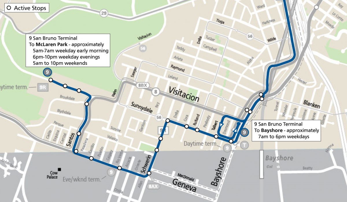 Update: Starting on Monday, May 18, 2020, with the return of the 9R San Bruno Rapid, the 9 San Bruno will resume using the terminal at Bayshore & Visitacion Valley on weekdays from 7am to 6pm.