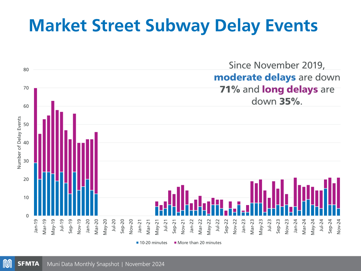 Since the prolonged Muni Metro shutdown during the pandemic, and with ongoing maintenance, we’ve seen major improvements to travel time and reliability. See more subway performance data.