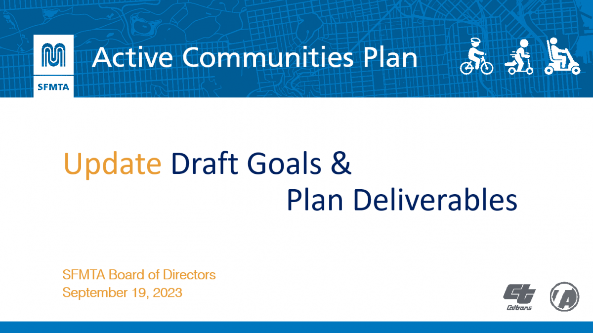 On September 19th, we will provide an update on the Active Communities Plan to the SFMTA Board of Directors. This presentation will include lessons learned from our public survey, draft goals and objectives for the plan, and proposed plan deliverables.