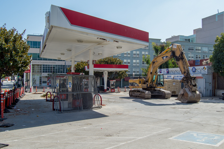 At 4th and Folsom, crews will demolish this former gas station to make way for the Yerba Buena/Moscone Station.
