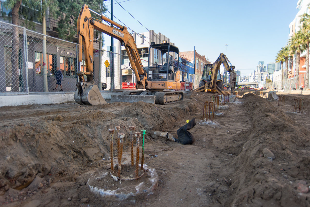 Foundation work for the 4th and Brannan surface station is being conducted in the center median. Surface Station, Trackwork and Systems Work along 4th Street between Bryant Street and King Street includes construction of a surface station between Bryant Street and Brannan Street. The construction team is upgrading utilities and trackwork on 4th Street between the tunnel portal at Bryant Street and the connection with the existing light rail system at King Street.