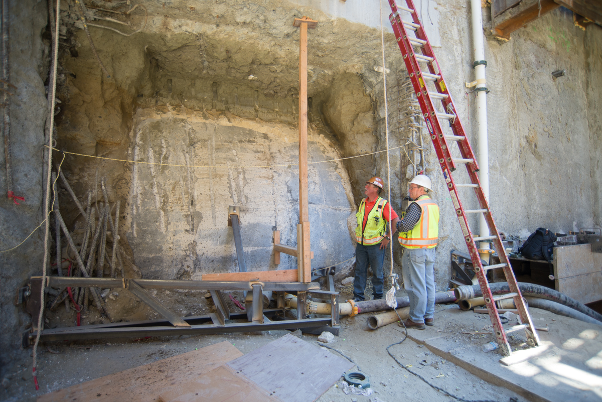 Workers install rebar inside the entrance of the station. Excavation of the north access shaft near Jackson Street. Overview