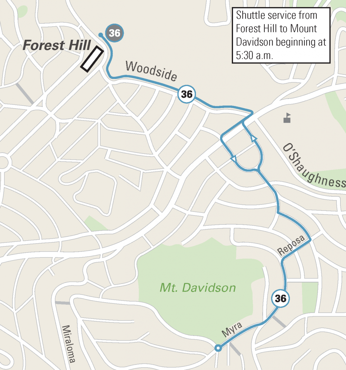 Muni will provide extra service on the 36 Teresita beginning at 5:30 a.m. from Forest Hill Station for the annual Easter Sunrise Service at Mount Davidson Cross. It will provide service to the park gate at Myra & Dalewood until 7:30 am. After the service concludes, the bus will make trips from Myra & Dalewood to Forest Hill Station.