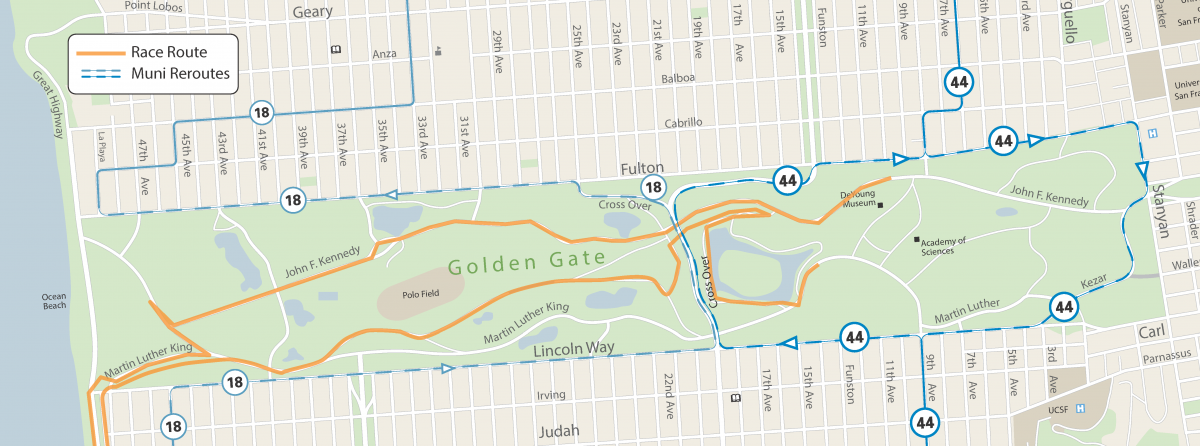 5 to 11:30 a.m. From 8th and Fulton via Fulton, Stanyan, JFK Drive, Kezar, Lincoln Way, 9th to regular route