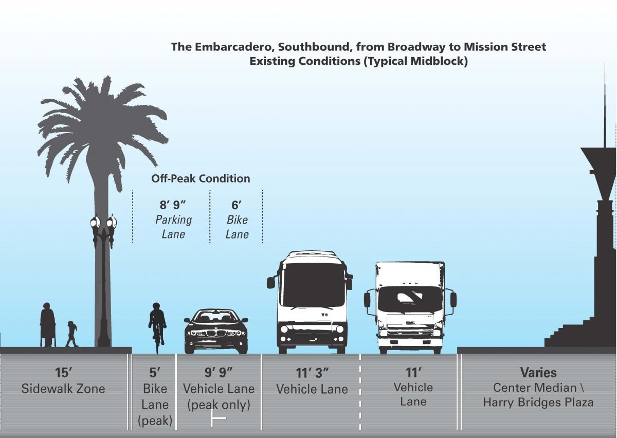 Current conditions along southbound Embarcadero include a “tow-away no stopping” curb lane restriction during the morning and afternoon peak commute periods (7-9am, 3-7pm).