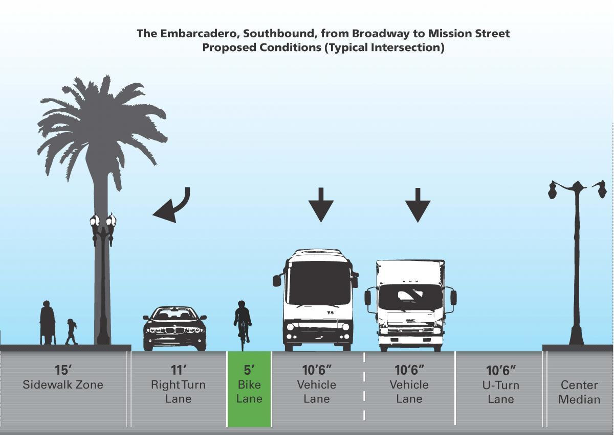 The time has come to make a change. As part of citywide efforts to eliminate such tragedies and prioritize safety no matter how one gets around (an initiative called ‘Vision Zero’), the SFMTA and Port of San Francisco have committed to installing near-term safety improvements along The Embarcadero as quickly as possible. These changes will begin in mid-October 2018 in the southbound direction between Broadway and Mission Street and will continue later into the year with additional crosswalk upgrades between Bay Street and Green Street.