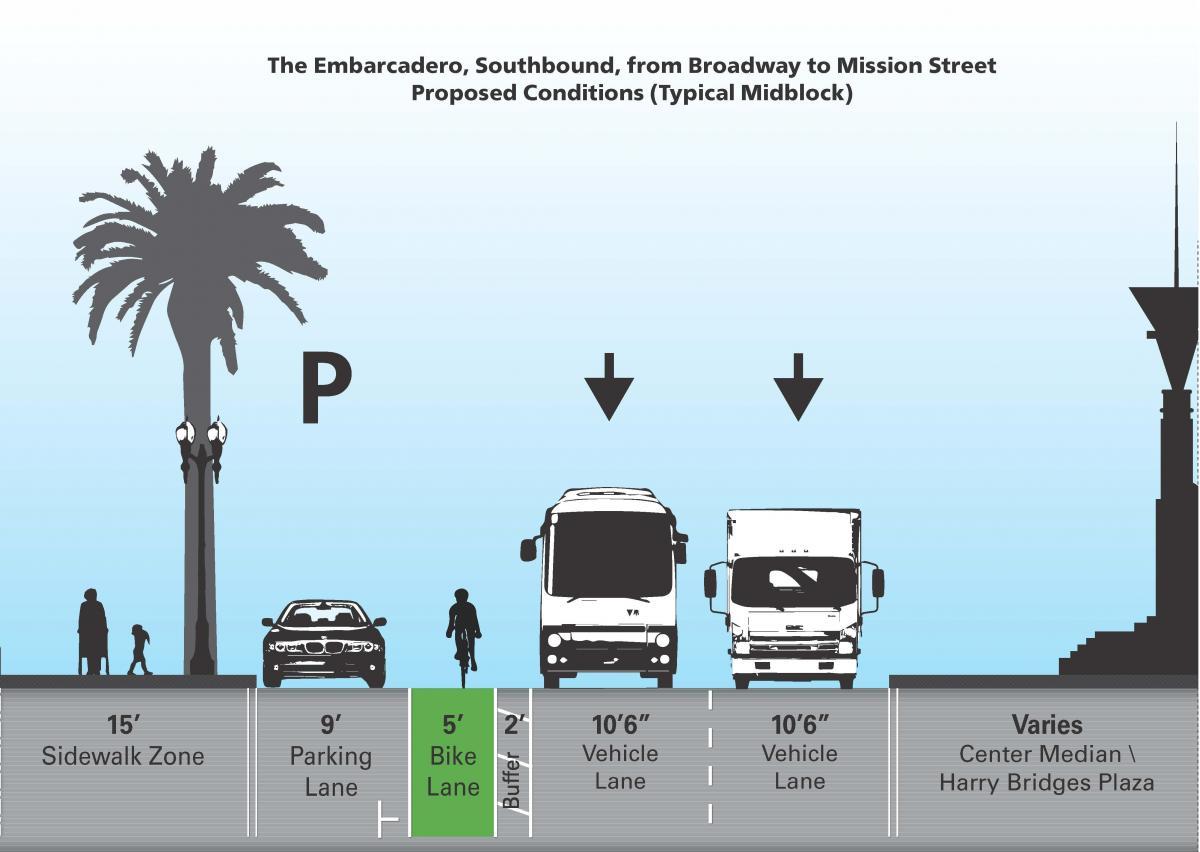 To improve safety and comfort for all users of The Embarcadero, the SFMTA and Port will allow all-day parking and re-stripe The Embarcadero with a full-time, green bike lane. Vehicle right-turn lanes will be provided at Washington and Mission streets to support the continued movement of people and goods. These changes will help provide a safer, more consistent, and more intuitive user experience along the city’s northeastern waterfront.