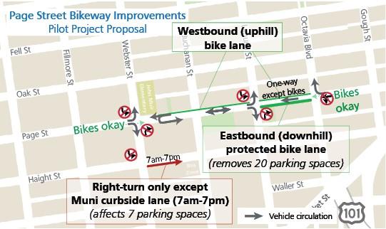 • A protected downhill bikeway and an uphill bike lane on Page Street between Octavia Boulevard and Laguna Street by converting that block to one-way westbound only for vehicles