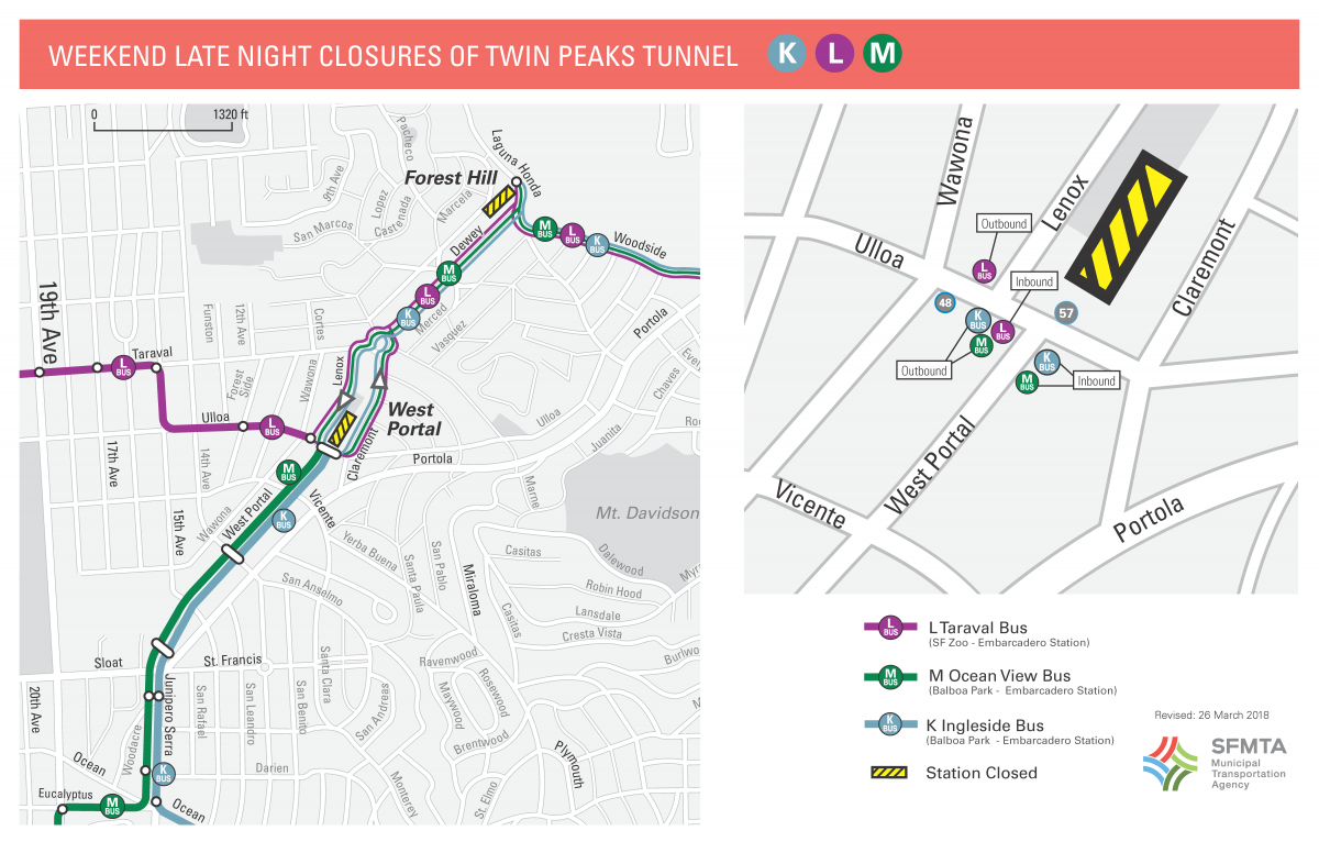 Weekend closures of the Twin Peaks Tunnel and bus substitutions will continue for most weekends through June in order to allow for important work to take place. Stations will continue to close early on Friday and Saturday nights to provide extra time to work inside the tunnel. A longer closure of up to 60 days is planned for summer 2018 to complete the full upgrade of the Twin Peaks Tunnel.