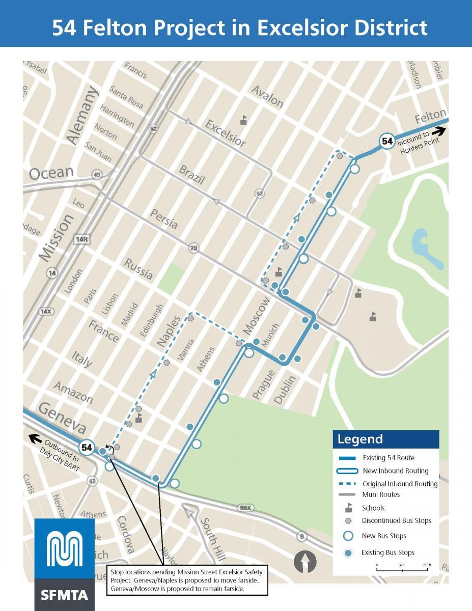 In the Excelsior neighborhood, a segment of the 54 Felton route runs on Athens Street. A narrow portion of Athens Street does not allow for the bus and another vehicle to pass. Based on feedback from neighbors and the District 11 Supervisor's office, the SFMTA is proposing an update to the 54 Felton route to address this concern and improve safety.