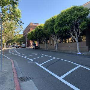 - 2018 – The peak period tow-away restriction between Broadway and Mission Street was removed. This near-term safe improvement allows all-day parking and established a full-time, green-colored bike lane. Vehicle right-turn lanes were provided at Washington and Mission streets to support the continued movement of people and goods.