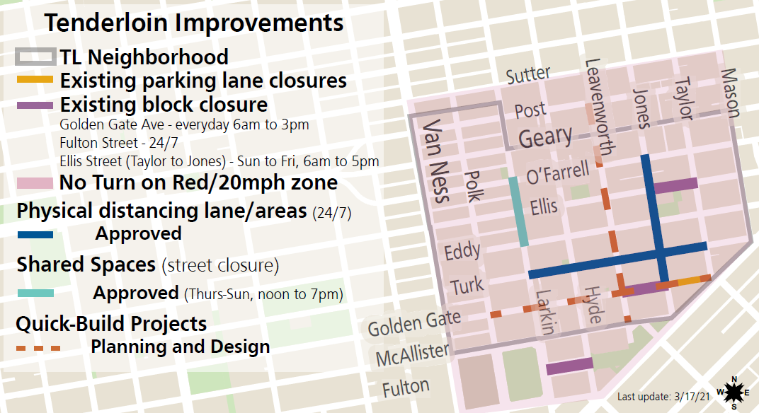 We want to express sincere appreciation and acknowledge the Tenderloin community groups who have been tenacious in advocating for traffic safety and travel options in their neighborhood: Tenderloin Traffic Safety Task Force, Tenderloin People’s Congress, Tenderloin Community Benefit District, Central City SRO Collaborative, Tenderloin Neighborhood Development Corporation and many others. We are committed to being responsive and partnering with the community as we work through this crisis together.