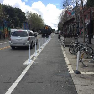 - Curbside Parklets: Some parklets will remain at the curb because it is a more convenient location for that business. In those cases, the bike lane will go around the parklet. People on bikes will still be protected from vehicle traffic.