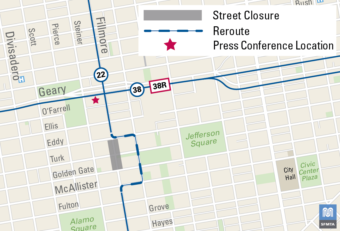 The 22 Fillmore will reroute onto Webster between McAllister and Eddy from 9:45 a.m. to 7 p.m.