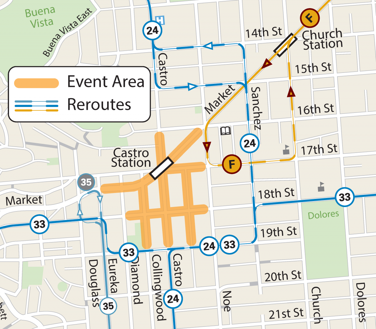 Map of Street Closures and Muni Reroutes for the Castro Street Fair