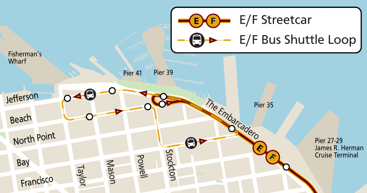 • The last streetcar stop toward Fisherman’s Wharf will be at Embarcadero & Stockton (Pier 39).