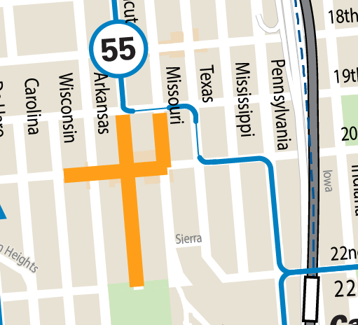 5:30 a.m. to 7 p.m. | From Texas & 20th via Texas, 19th, Connecticut to regular route | ||