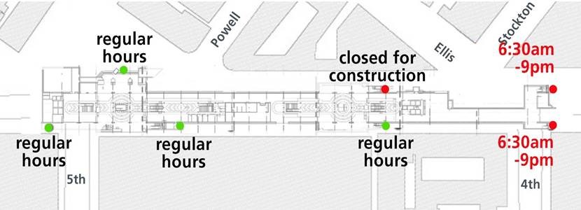 Starting Tuesday, February 20, BART will operate the eastern entrances to Powell Station (at Stockton/Ellis and 4th Street) with limited hours. The entrances will open at 6:30 a.m. and close at 9 p.m. on weekdays.