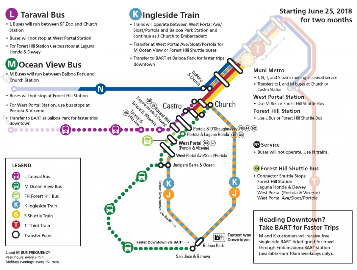 While the tunnel is closed for construction, buses will run for the M Ocean View and L Taraval lines. K Ingleside trains will run a shorter route between Sloat/St. Francis and Balboa Park. There will not be K Ingleside, L Taraval or M Ocean View trains running in Muni Metro.