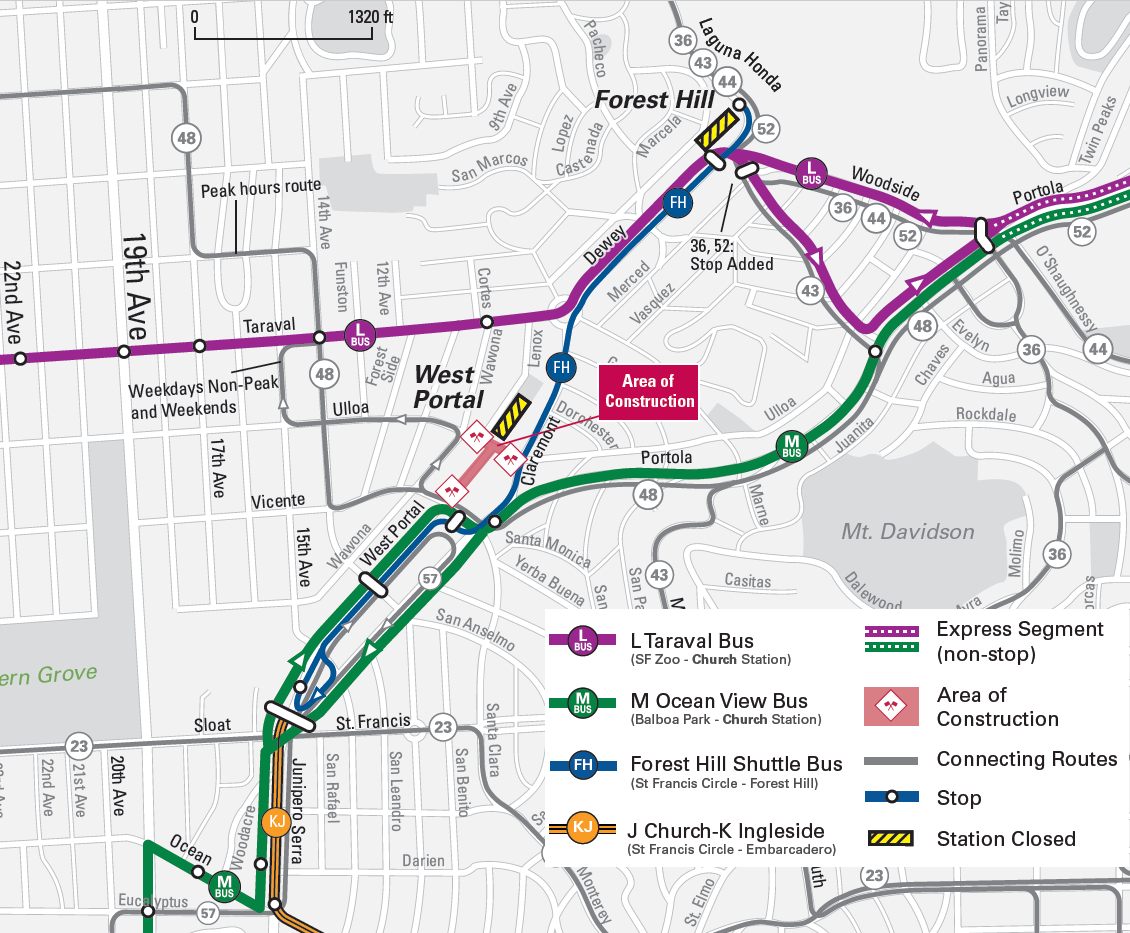 - Para sa West Portal Station, gamitin lamang ang M bus o Forest Hill Shuttle.