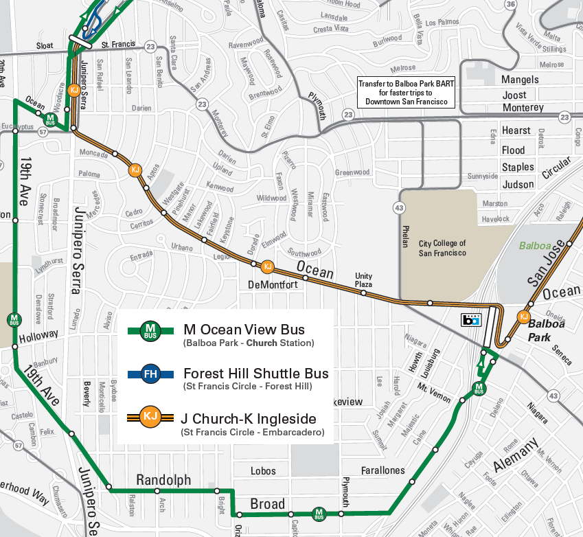 Trains will serve regular stops between Sloat/St. Francis and Balboa Park. Once K Ingleside trains reach Balboa Park, they will continue downtown as J Church trains.