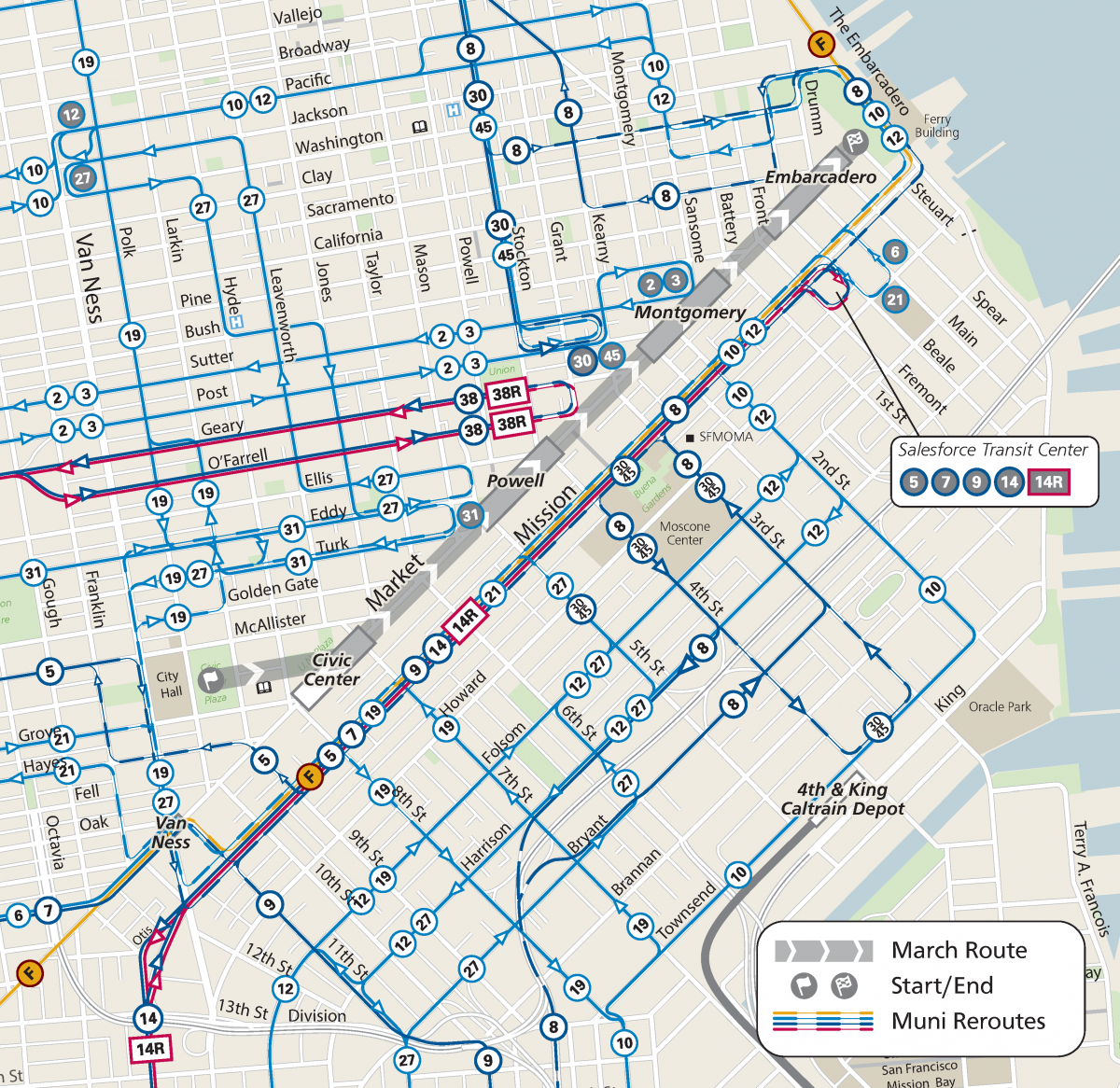 Most routes will switchback--changing from inbound to outbound--before they reach Market Street. Some routes will operate on Mission Street instead. Most routes that cross Market Street will be rerouted around the event areas. The 30/45 SoMa Shuttle will also operate in a loop between the Caltrain Station and Mission Street until the march is over. Reroutes start at different times, but all service will return to normal once Market Street is clear.