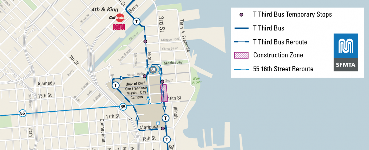 Phase C construction for the UCSF Mission Bay Platform Upgrade project will start the platform reconstruction. Part of 3rd Street will be closed and Muni will reroute buses in the area, including the T Third Bus Substitution. Read below for more detailed information.