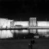 A view of Treasure Island and the brightly lit fairgrounds taken from Yerba Buena Island at night circa 1939.
